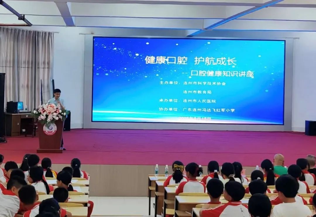 科普讲座环节,广州医科大学附属口腔医院帮扶连州市人民医院口腔中心的专家方颖、彭菁主治医师为学生们带来了一场生动有趣的口腔健康知识讲解。她们通过图文并茂的PPT和实物演示,向学生们讲解了牙齿的结构、龋病的影响。医生们特别强调了预防错颌畸形的重要性以及牙外伤的处理,并鼓励学生们每天坚持刷牙、定期检查牙齿。讲座内容通俗易懂,围绕口腔结构、常见口腔疾病、日常护理预防方法等展开,详细介绍了龋齿、错颌畸形等疾病的成因、危害及预防措施,强调每天至少刷牙两次、每次刷牙时间不少于3分钟,以及使用含氟牙膏、牙线清洁牙缝的重要性。同时,针对儿童换牙期、青少年正畸期等不同阶段的口腔特点,给出了个性化的护理建议,帮助不同年龄段的学生掌握适合自己的口腔护理方法。