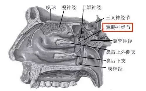 蝶腭神经节,也称翼腭神经节。是中枢神经系统内最大的副交感神经节,左右各一。位于颜面深部的翼腭窝内,发出许多细小分支,分布在鼻、咽、腭及眶部,支配这些部位的腺体和血管,其中就掌握着鼻功能的兴奋和抑制,包含交感神经和副交感神经。